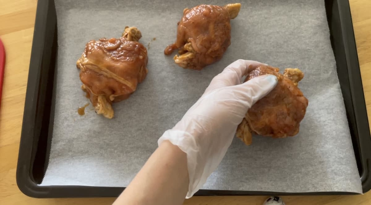 5. 天板にクッキングシートを敷き、4.の肉を並べる。余熱なしのオーブン200℃で12分〜15分加熱したら完成!