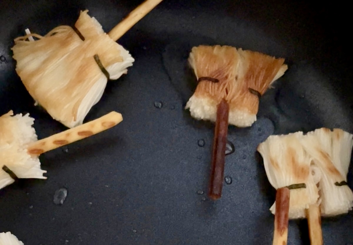 5. フライパンに油をひき、中火で海苔のとじ目側から焼く。