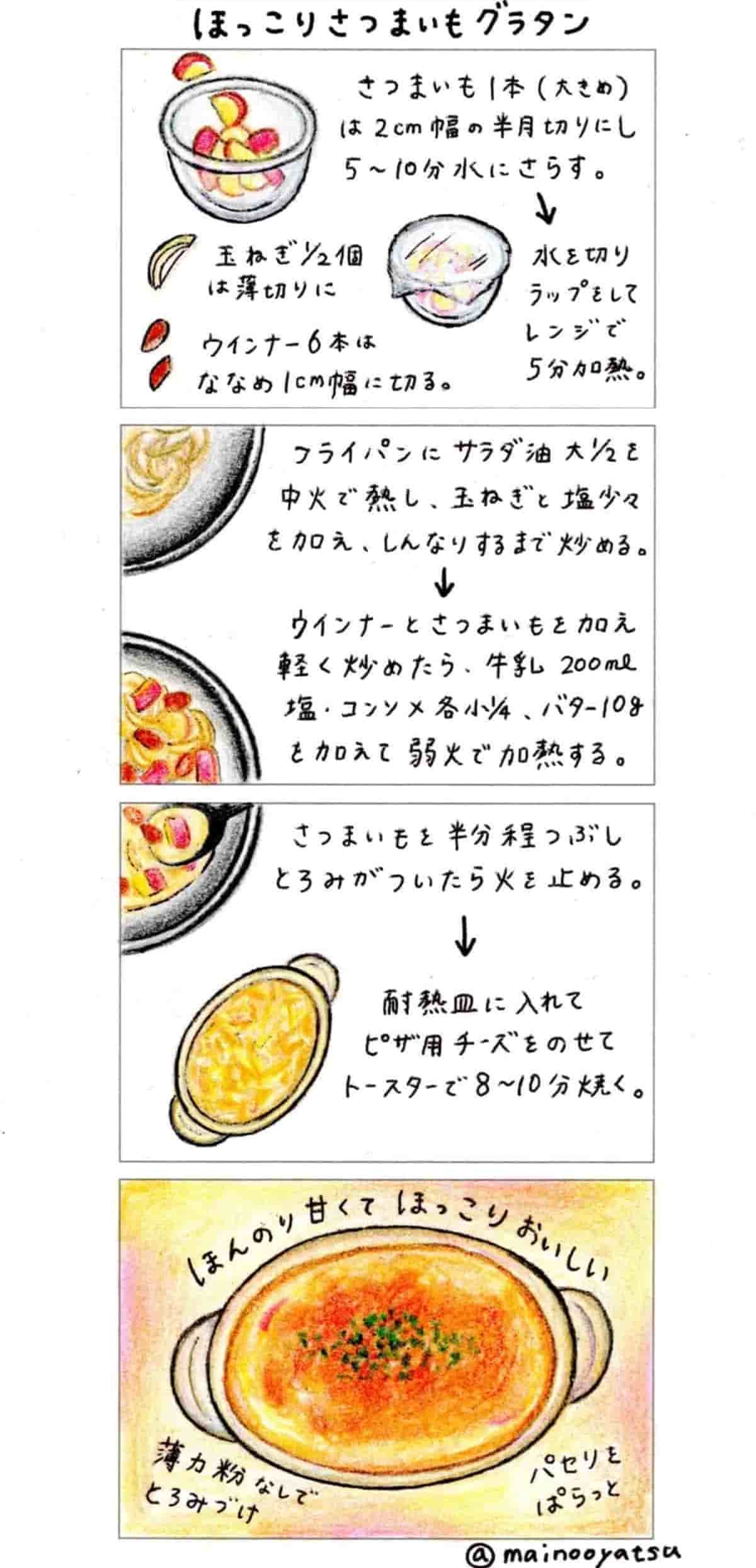 あたたかいタッチのイラストレシピが大人気のまいのおやつさんに、“家族が喜ぶほっこりごはん”をご紹介いただくフーディストノート公式連載。今回は、小麦粉いらずなのにとろみがつく「ほっこりさつまいもグラタン」ご紹介いただきます♪