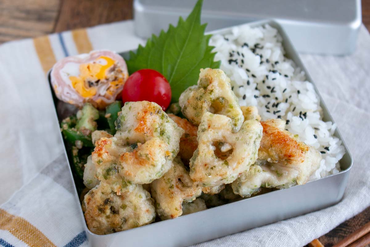 れんこんのシャキッとした食感と、しっとりやわらかな鶏むね肉の組み合わせに、青のりの風味がふわっと広がり、まるでスナックのような軽やかさです。