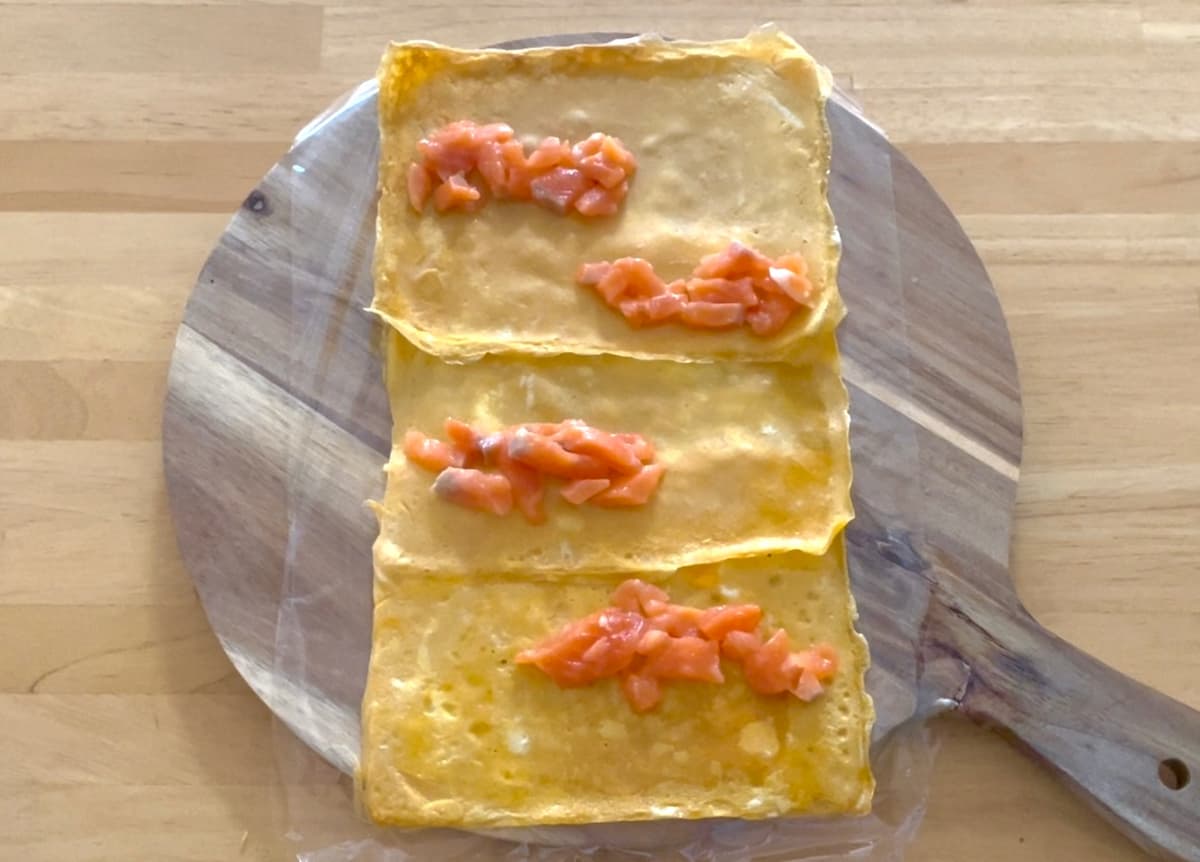 1. 薄焼き卵3枚の長い辺が、少しずつ重なるように並べる。その上に、間隔をあけながらサーモンを左右交互になるようにのせる。