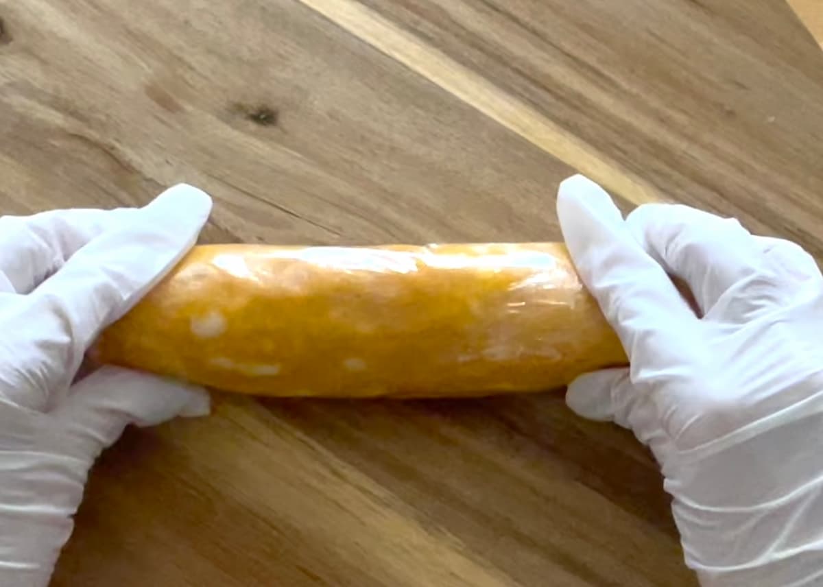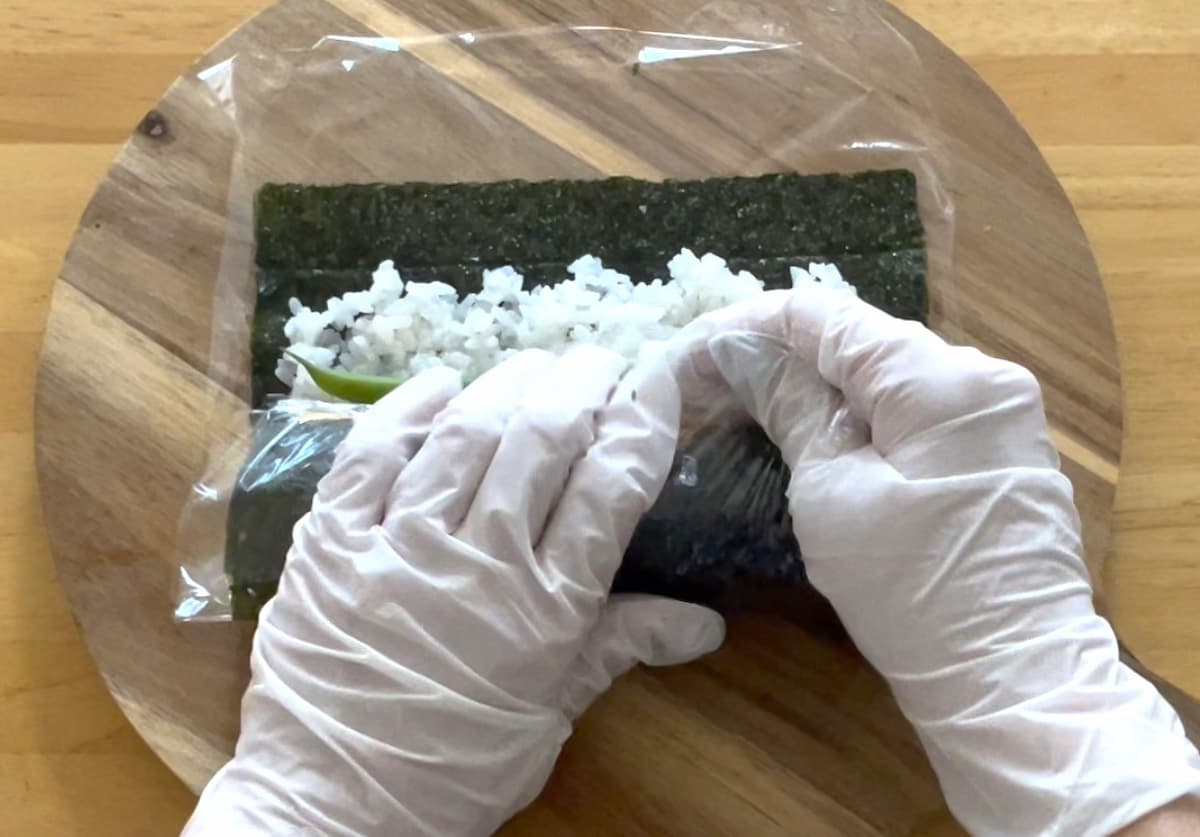 2. 手前から具材を巻き込むように、きつめに巻く。ラップで包んでしばらくおく。