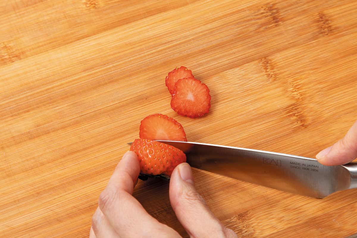 フルーツを切る→パンにクリームチーズを塗る→フルーツをのせる