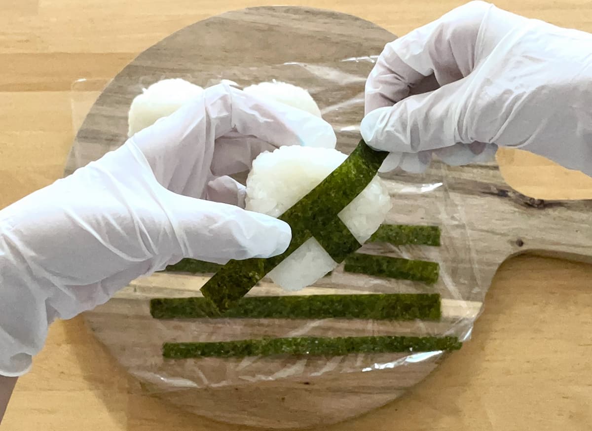 2. 1:2の短い方の海苔をおにぎりに縦に貼り付け、長い方は横に巻きつける。