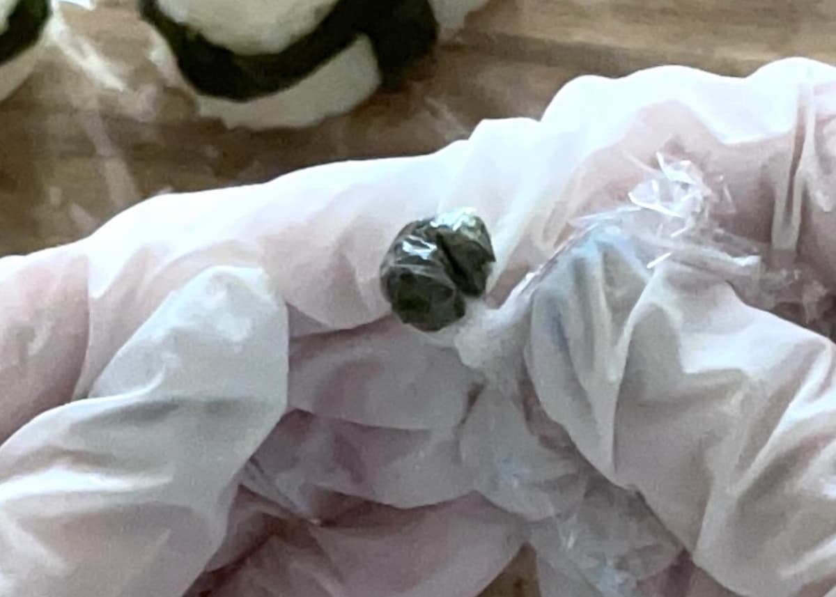 4. 3等分した海苔それぞれにご飯を少量のせ、ラップで包んで丸めてまげを作る。