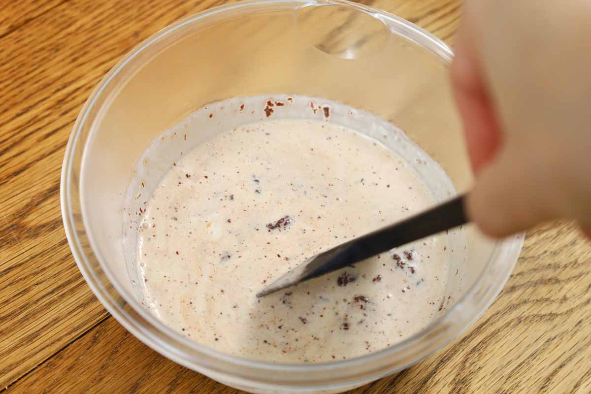 ゴムベラや泡だて器で、中央部分を細かくクルクル混ぜます。