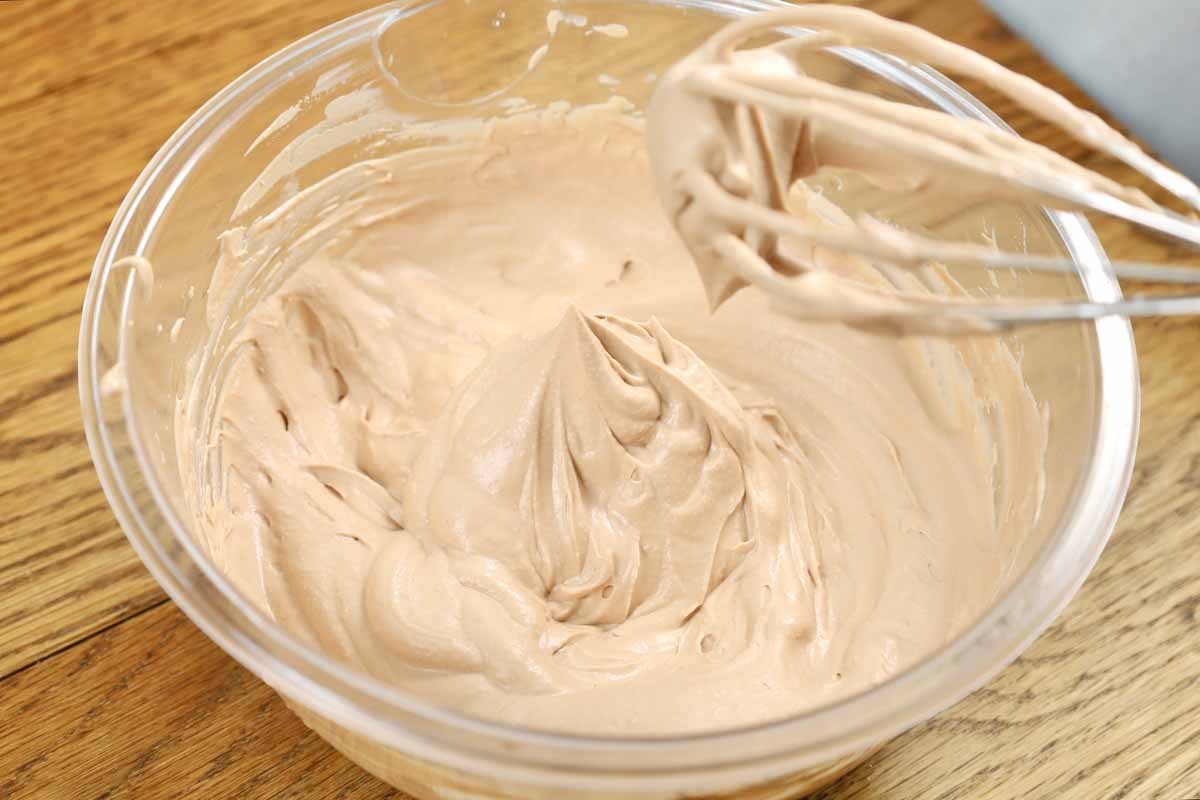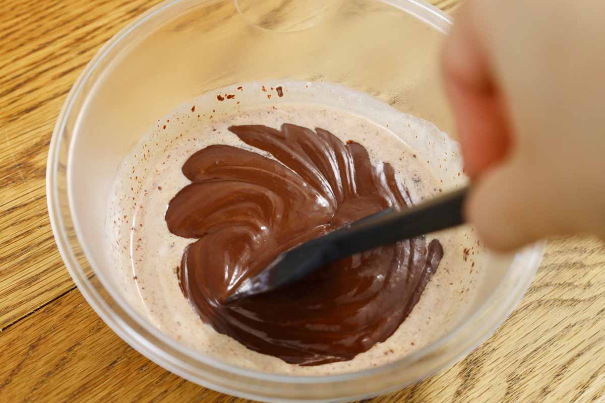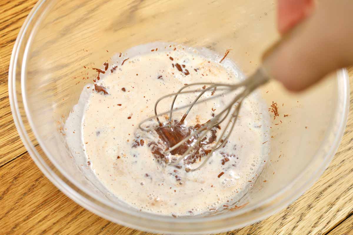 通常の生クリームって、泡立てすぎるとボソボソになってしまいますが、チョコレートを加えるとよりボソボソになりやすい!!なので、混ぜすぎないように様子を見ながらクリームを泡立てていきます。