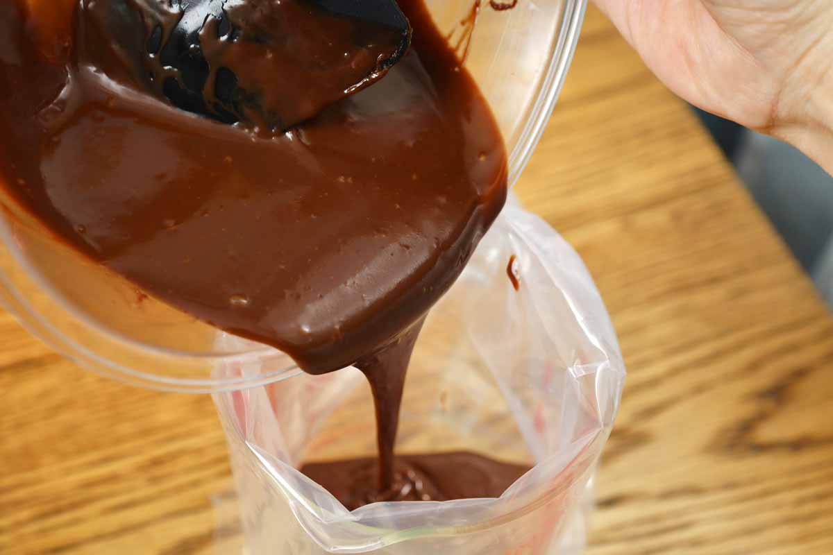 次に、しっかり冷え固まったガナッシュを側面に絞っていきます。一度軽くモミモミしてから使うと、スムーズに絞れるよ!(ガナッシュ絞りで失敗しそう…と怖い場合は、ビター板チョコ3枚+生クリーム150mlを加熱して混ぜ、1.5倍量のガナッシュを用意しておくのがおすすめです)