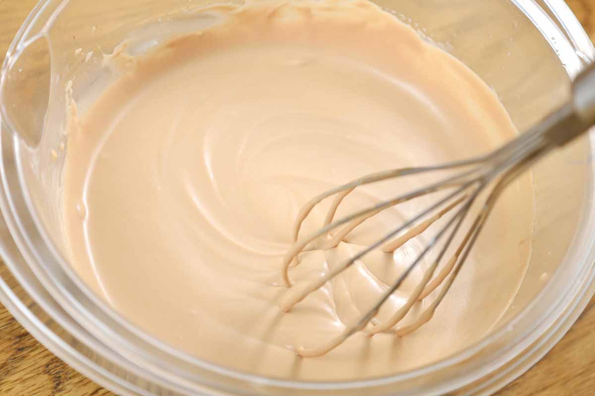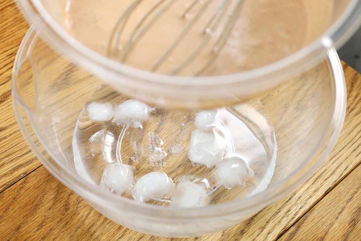 あとはいつもの生クリームと一緒で、別ボウルに用意した氷水に当てて冷やしながらホイップするだけ!チョコレートに砂糖が入っているので、別途で砂糖を加える必要はありません。