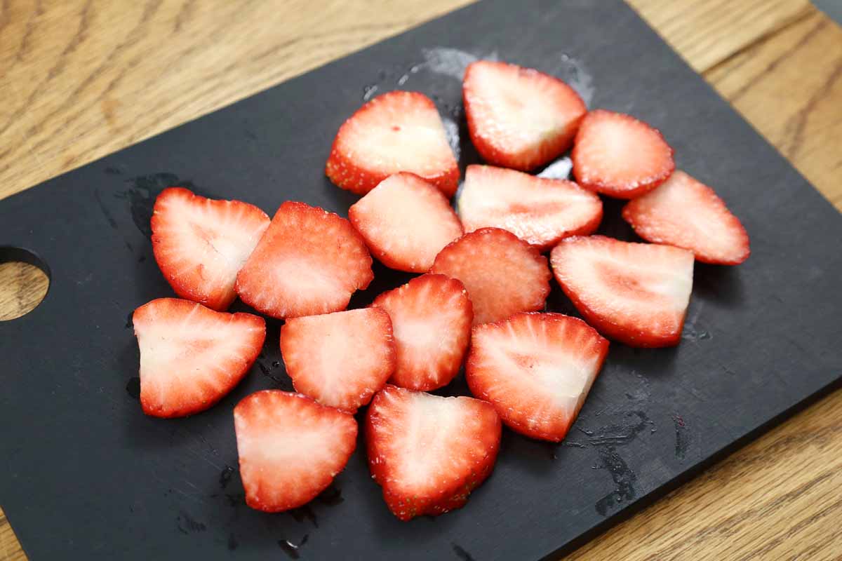いちご4~5個はヘタを除き、縦に4等分にスライスしておきましょう。