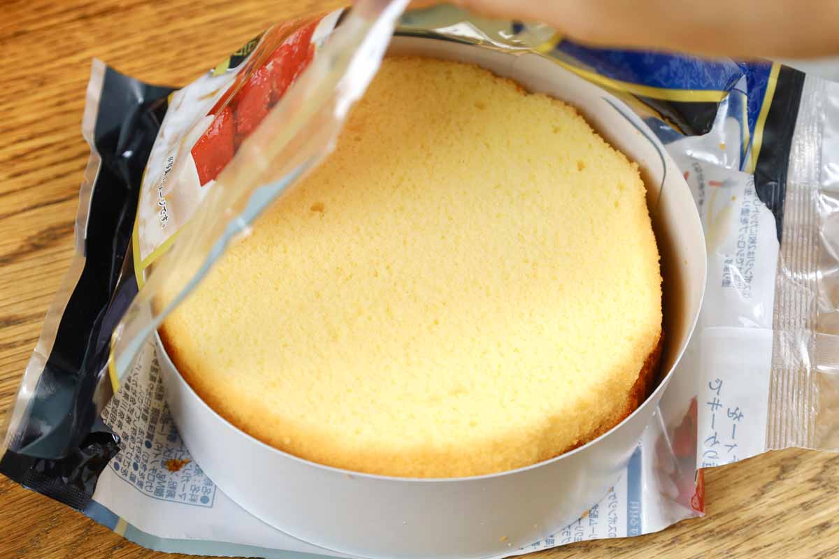 市販のスポンジ5号サイズ(直径15cm)を開封。もしカットされていないタイプなら、横半分に切って使います。
