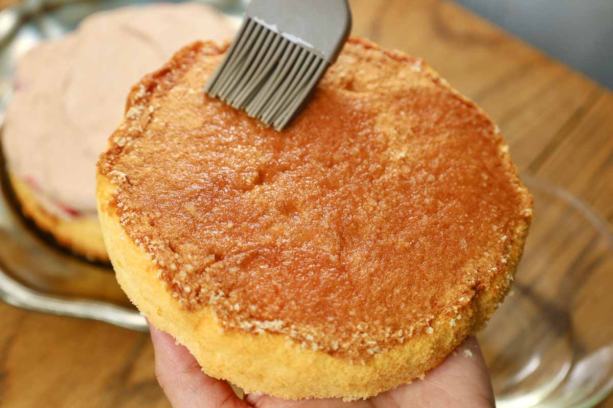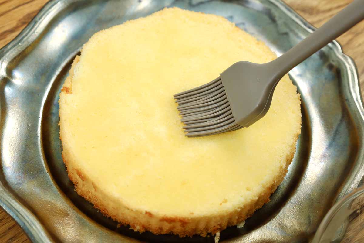 スポンジをひとつ置いたら、ケーキシロップを表面に塗ります。