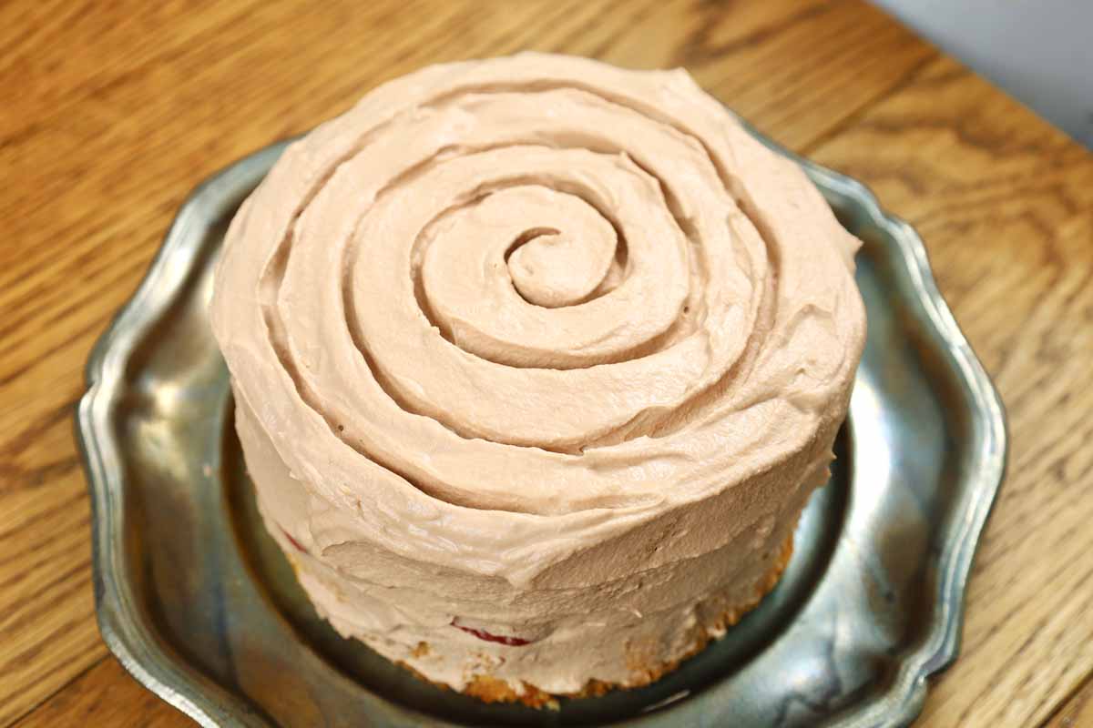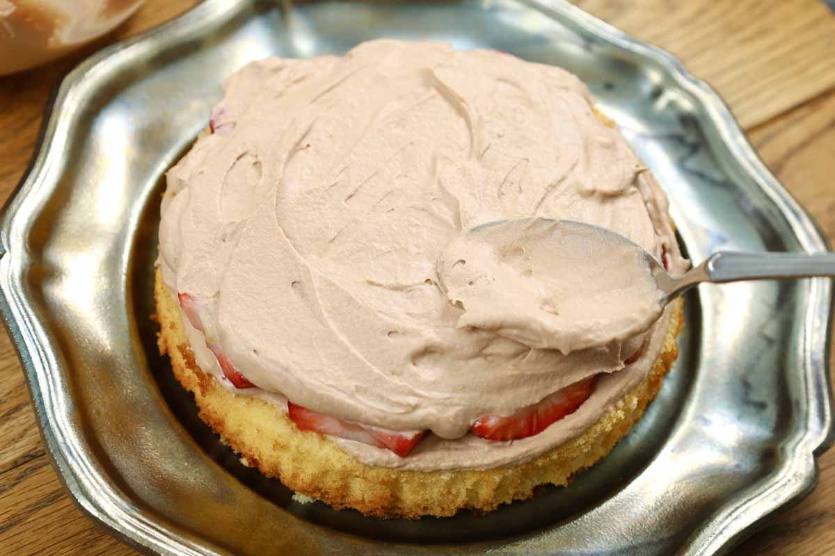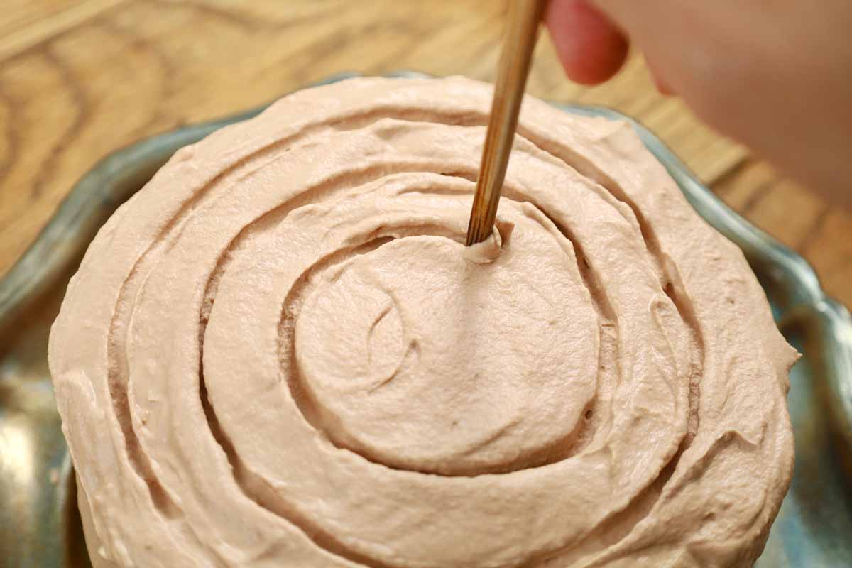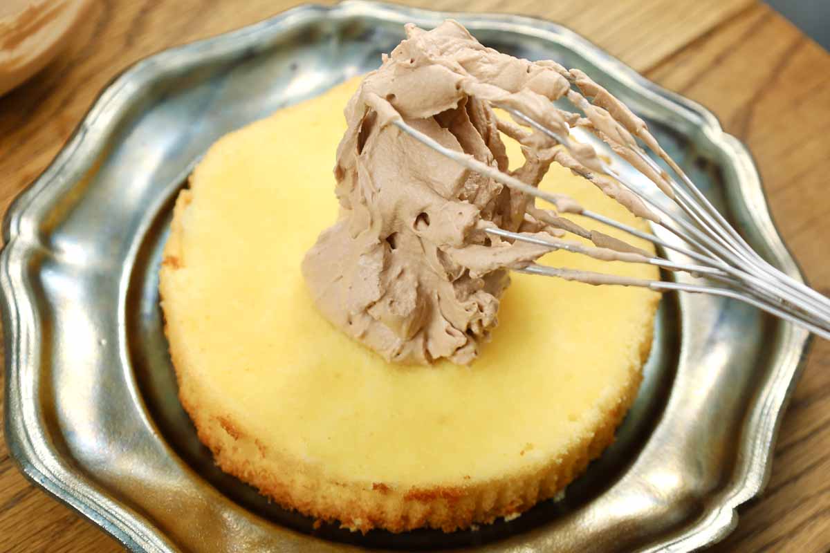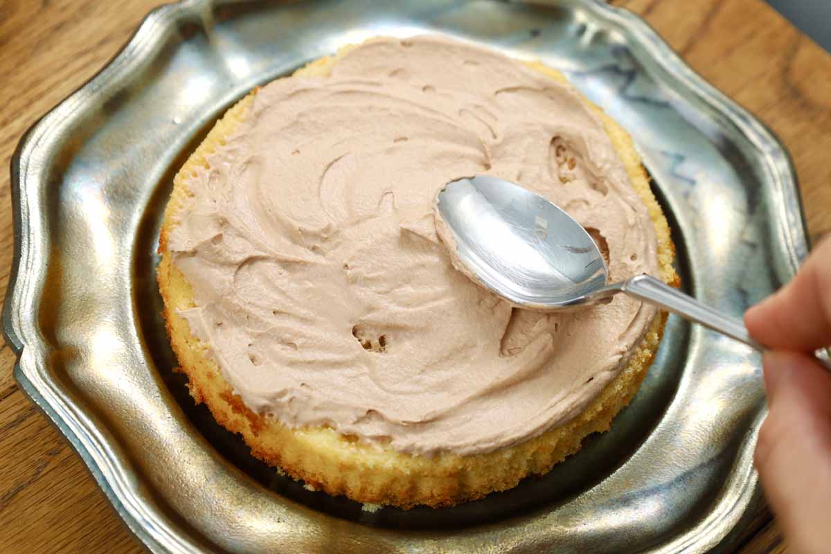 残りのチョコ生クリームを上にのせ、再びスプーンの背で平らにならします。表面を整えた後にクリームが余っていたら、側面に塗ります。この後ガナッシュを絞ると隠れてしまうので、きれいにナッペする必要はないです!気楽に塗ってください!