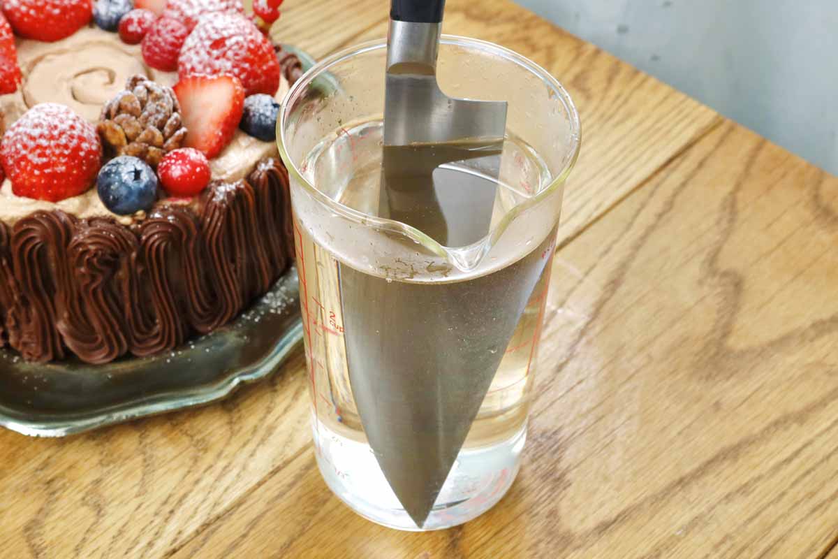 ちなみにケーキをカットする際は、計量カップなどにお湯を張って包丁をしっかり温めてから切ると、断面がきれいにカットできます。包丁は1回切るごとに、ついた生クリームやチョコレートをふき取り、再びお湯で温めてから使用してください。