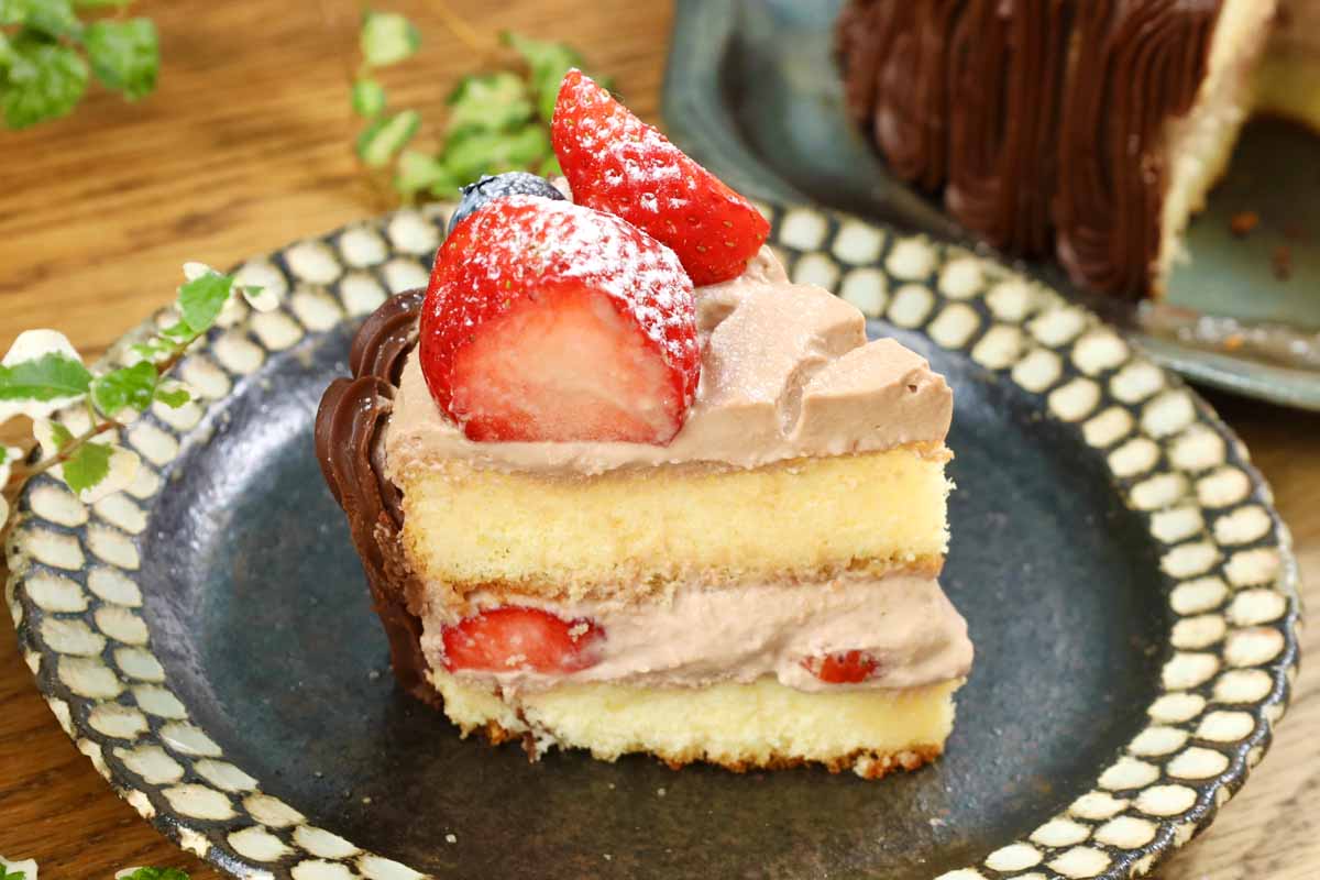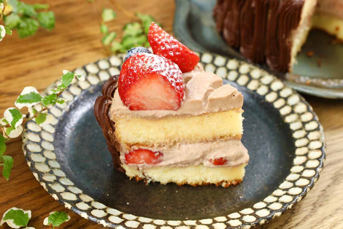 今回はベリー系の果物を使用しましたが、チョコと相性のよいバナナで作ってもすごくおいしいです。(中をバナナにして、表面だけいちごを使用することで、豪華なのに節約なケーキに!)