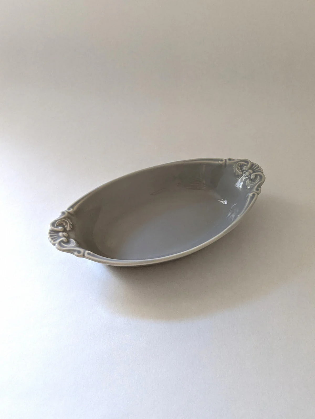 両側に小さな持ち手が付いているので、熱々の料理を運ぶ際にも安心。グラタンやドリアなど、アツアツのオーブン料理にぴったりの耐熱皿です。カラーはベージュとグレーの2色展開です。