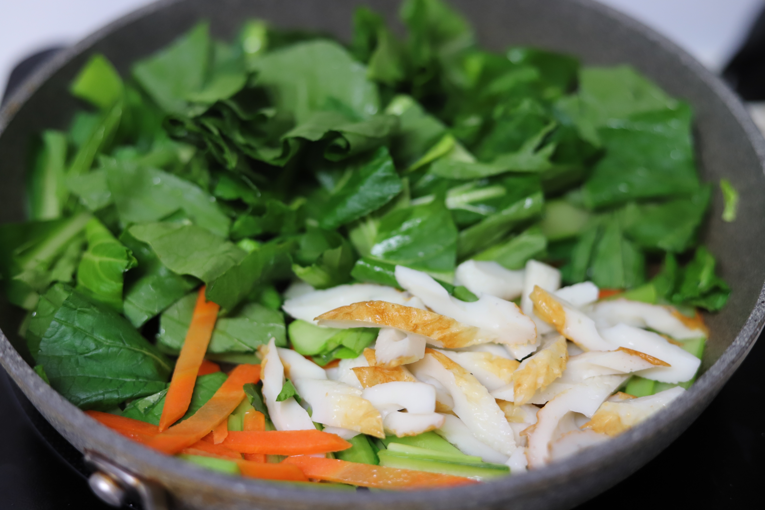 3. にんじんがしんなりしたら、小松菜の葉とちくわを入れさらに炒める。