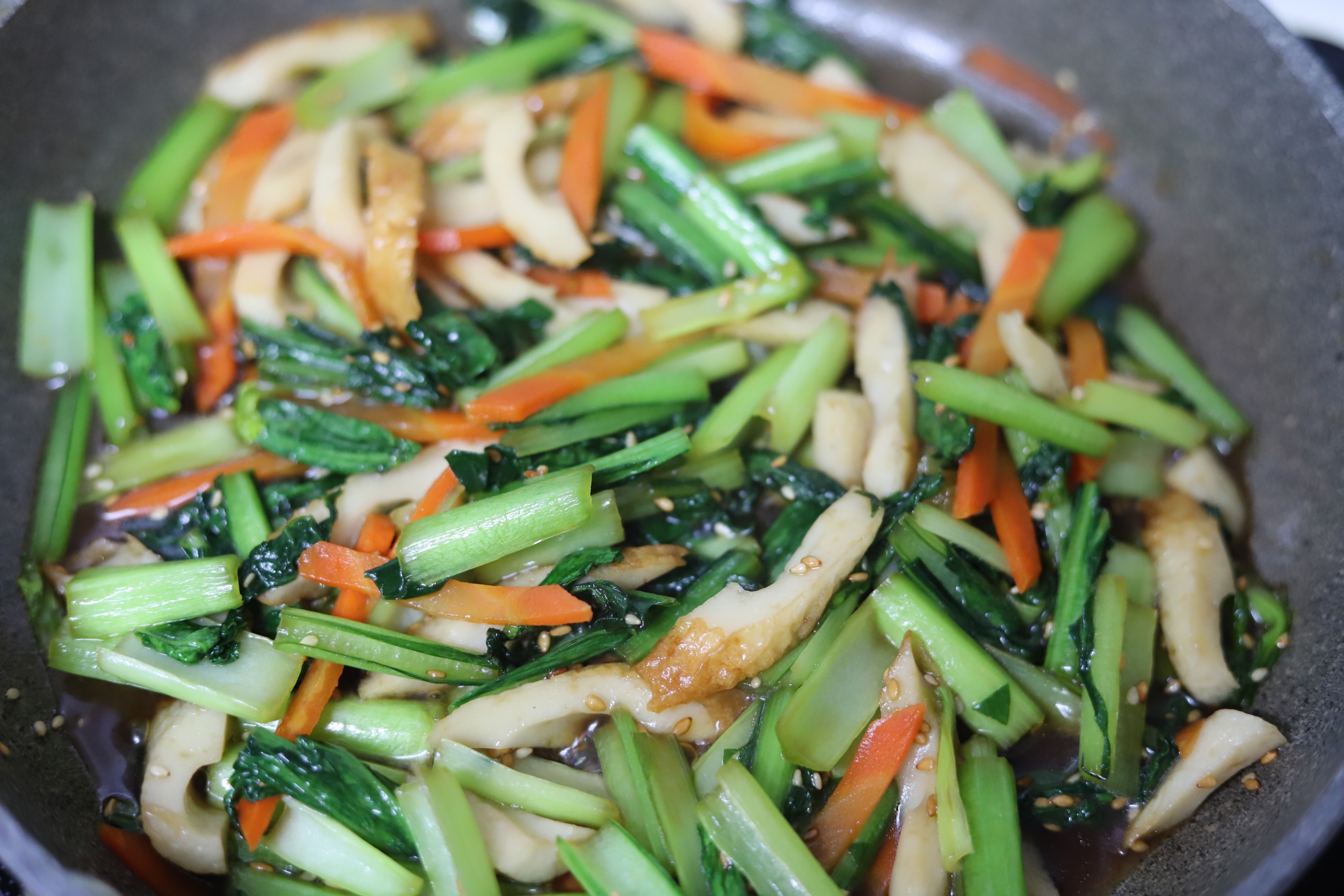 4. 小松菜の葉に火が通ったらAを加えてサッと炒め、ごま油を回しかける。