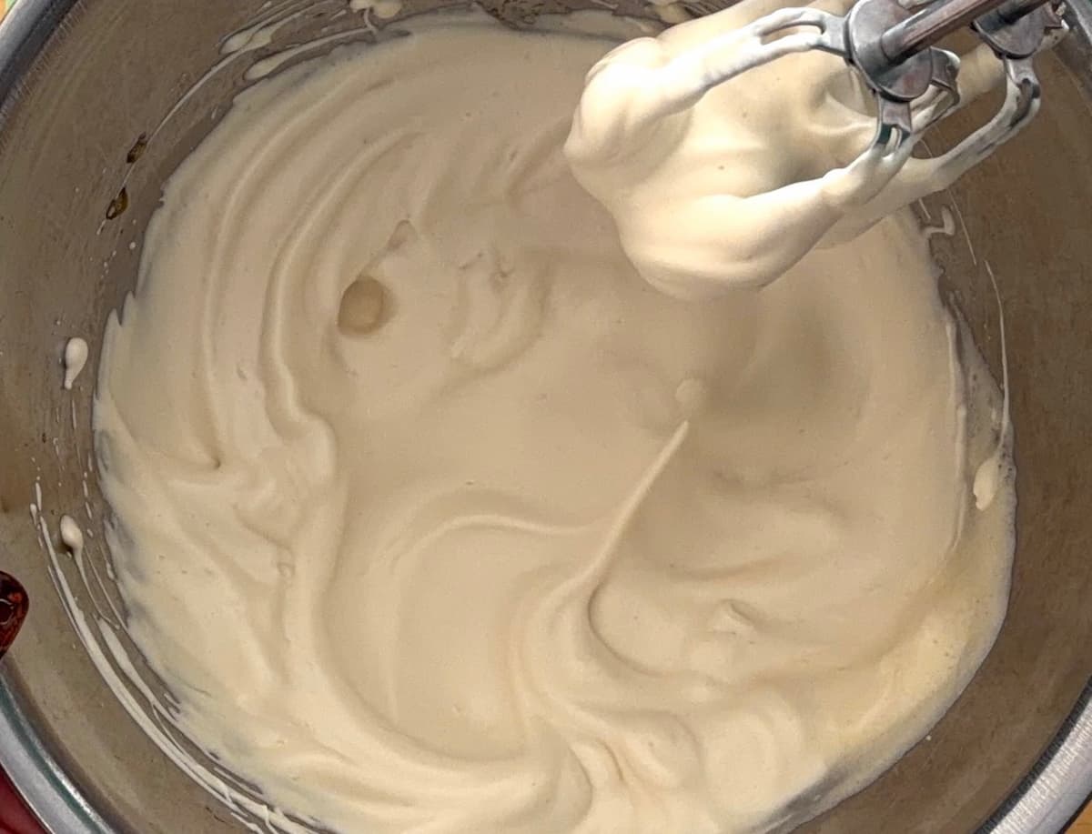 3. 卵白にきび砂糖Bを2〜3回に分けて加えながら、つのが立つまで、しっかり泡立てる。