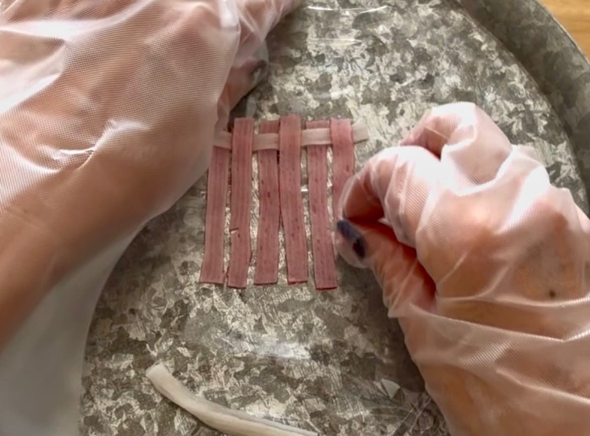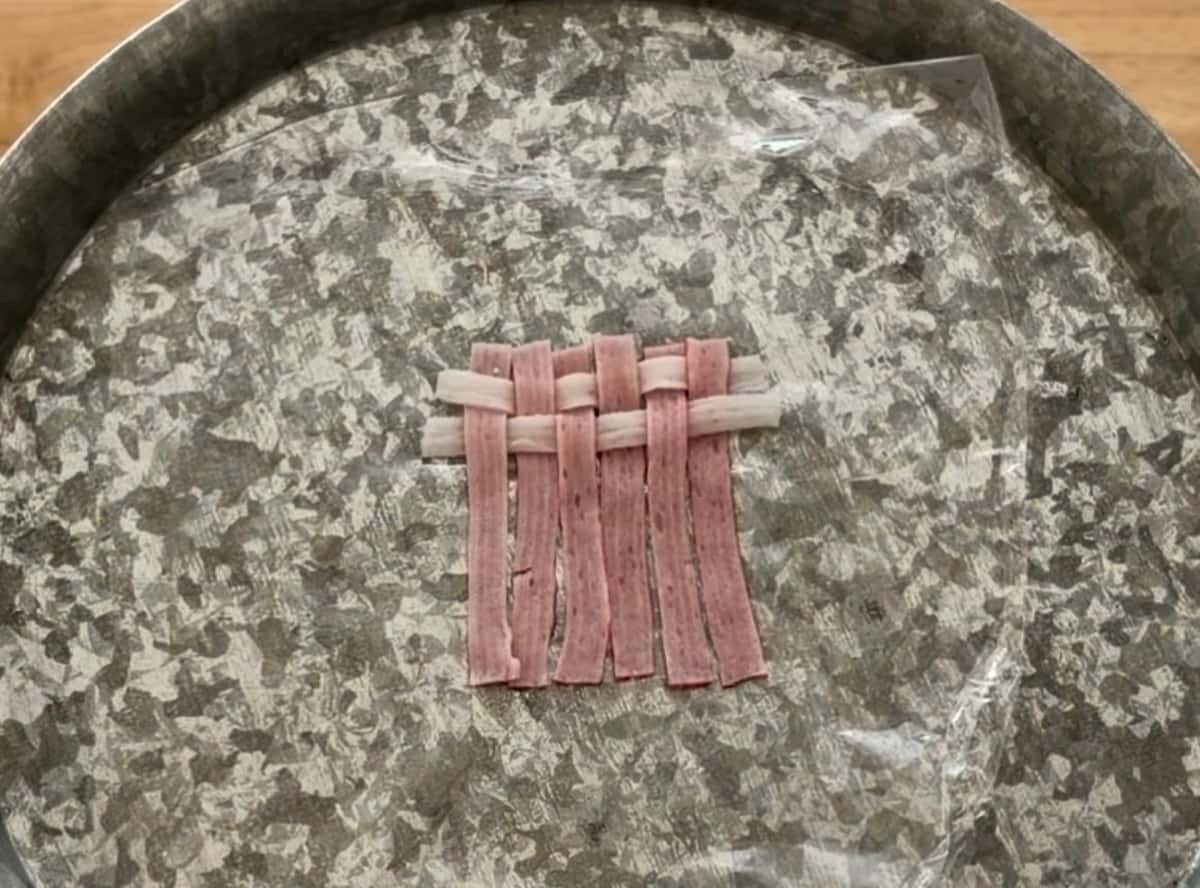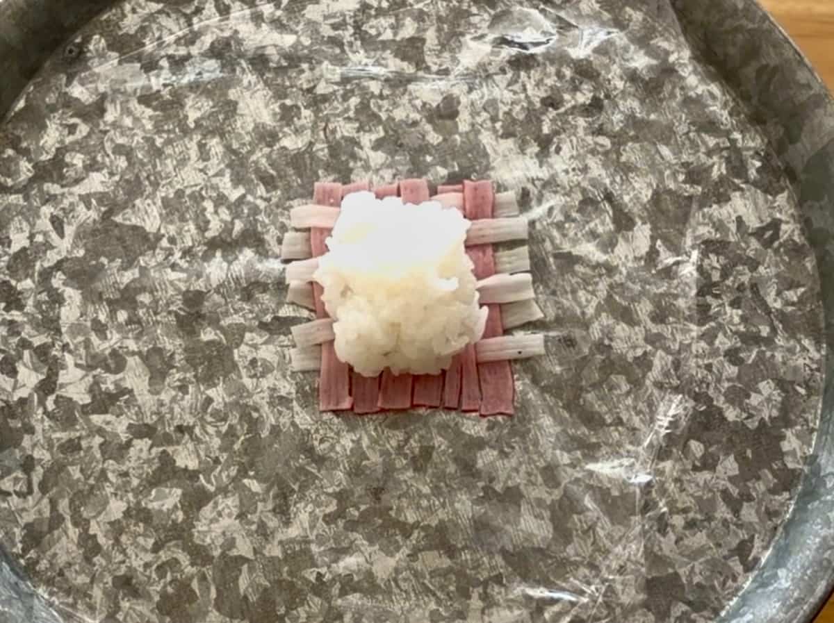 1. ラップを広げ、その上にカニカマの赤い部分6本を裏返して並べる。
