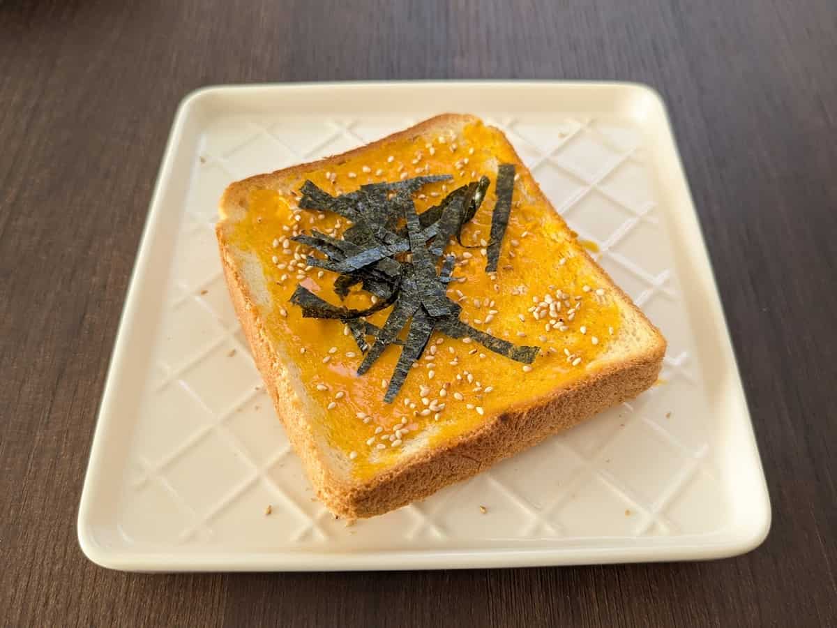 刻み海苔と白ごまをトッピングしてみました。いつものバターよりもしっかりと塩味が感じられて、パンがすすみます!うにの甘味は控えめですが、コクやまろやかさが感じられておいしいです。生臭みはなく、どなたにも食べやすそうな印象。