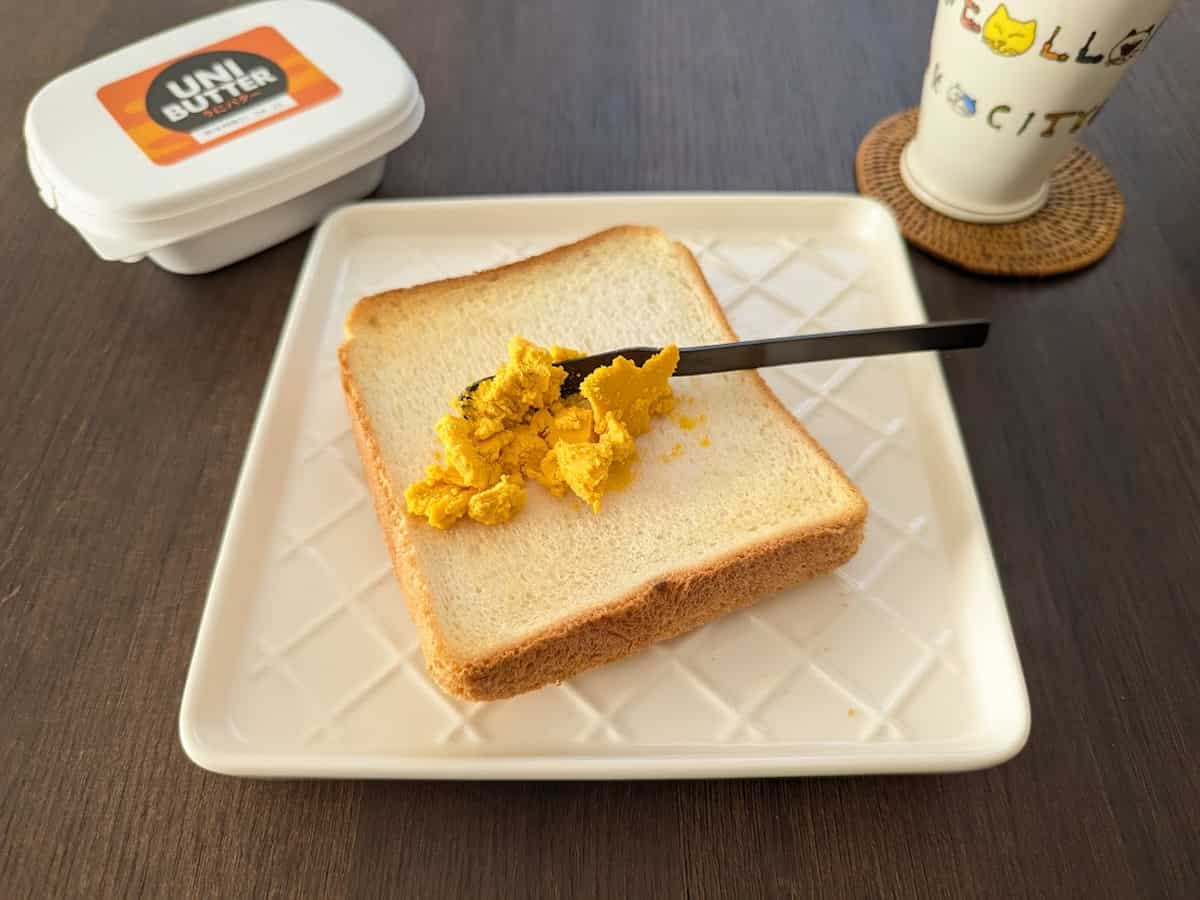 公式サイトの説明によると、パンやパスタ、ご飯など何にでも合わせやすいようです。まずは定番のトーストに使ってみました。熱々のパンにのせると、うにバターが溶けてするすると伸びていきます。