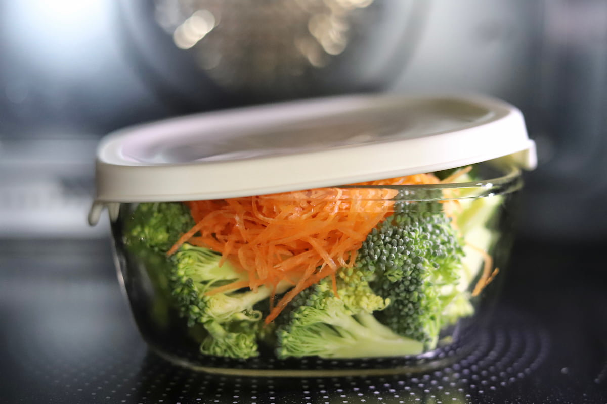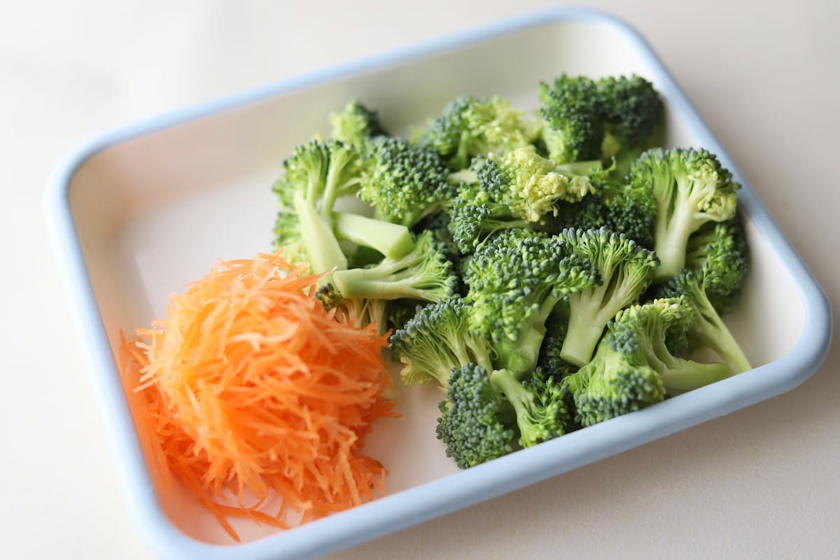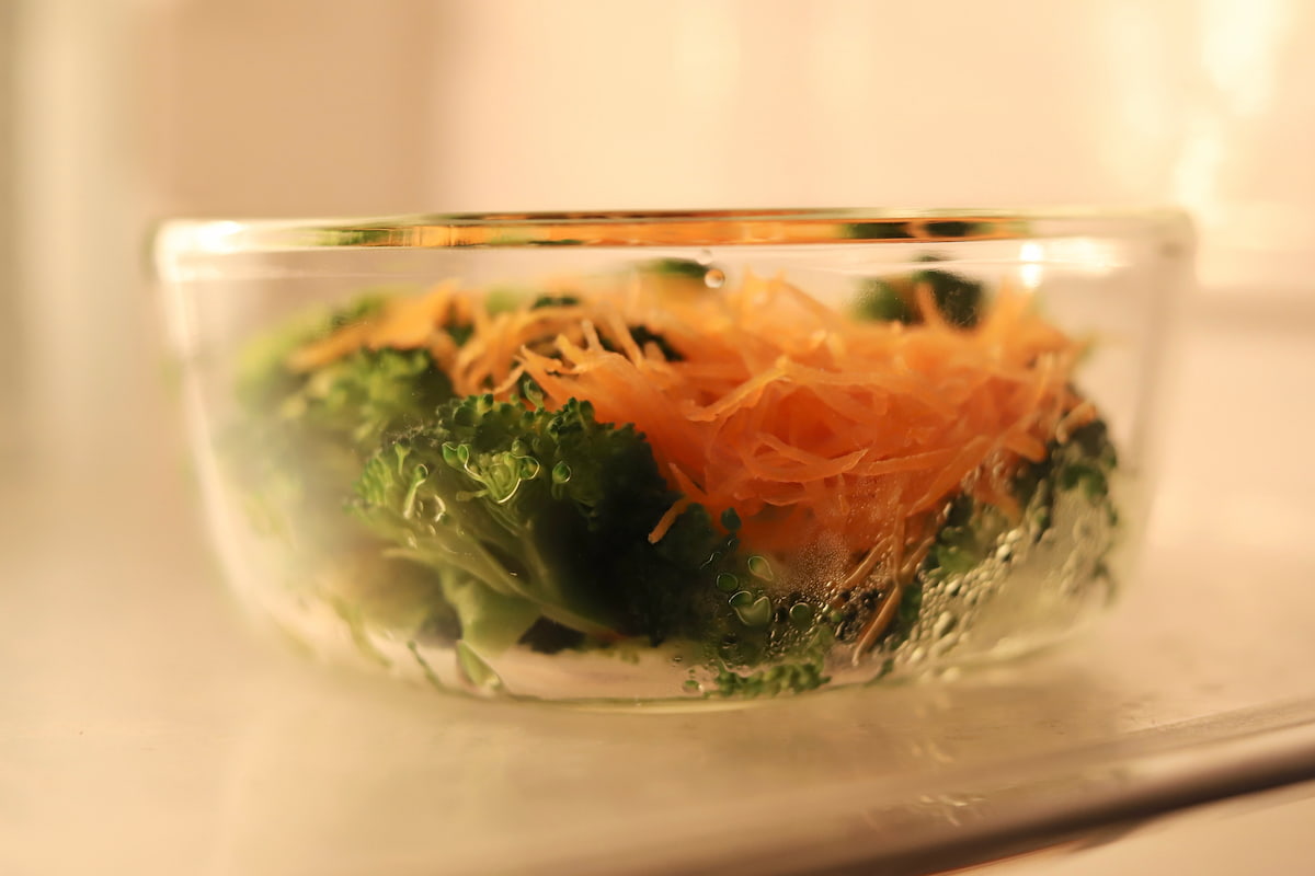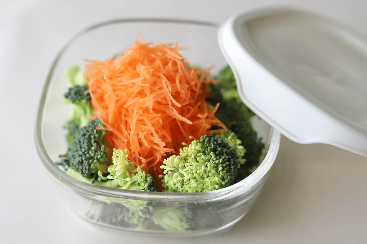 2. 耐熱容器にブロッコリーとにんじんを入れる。