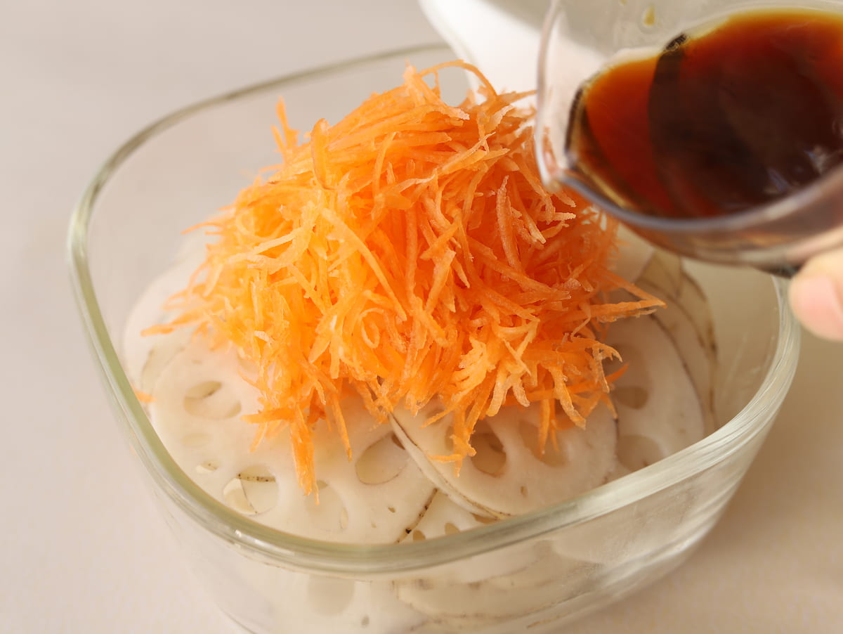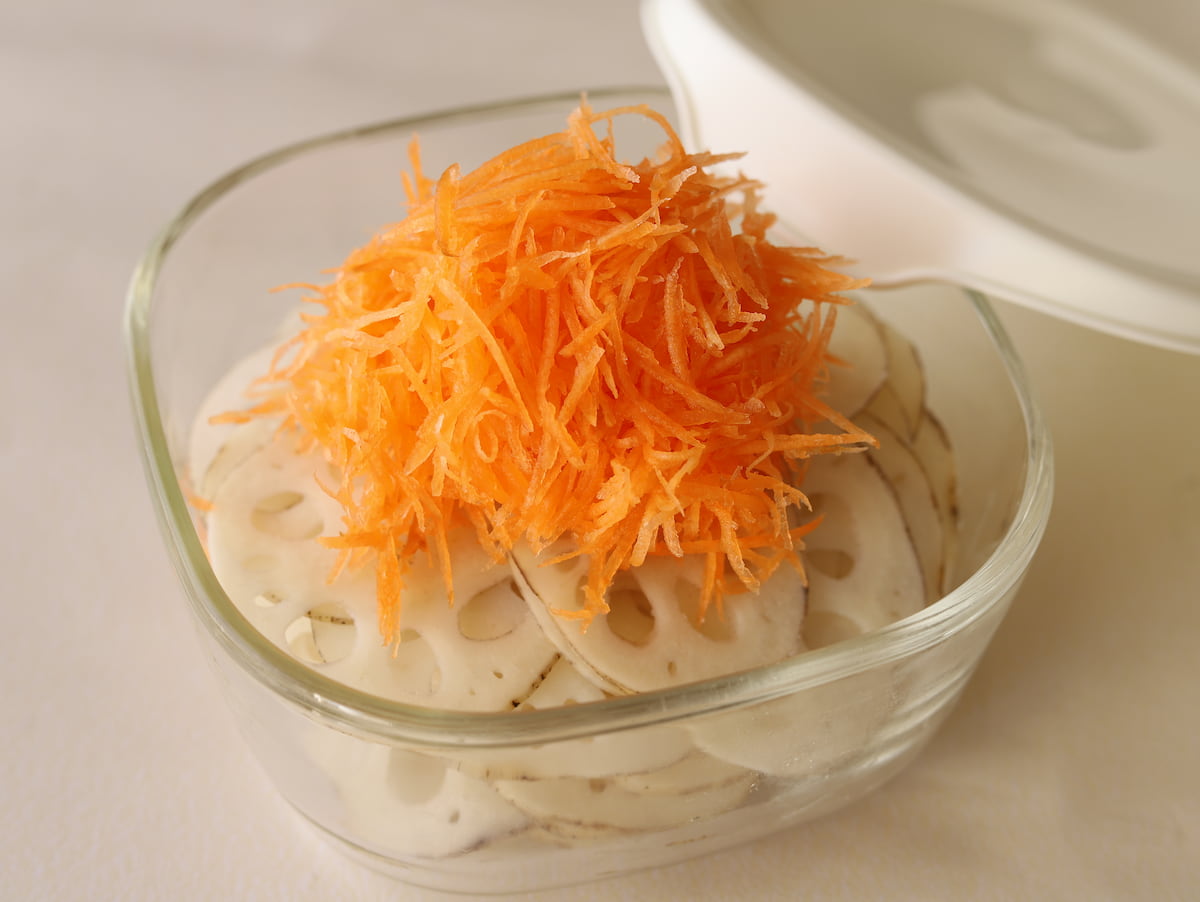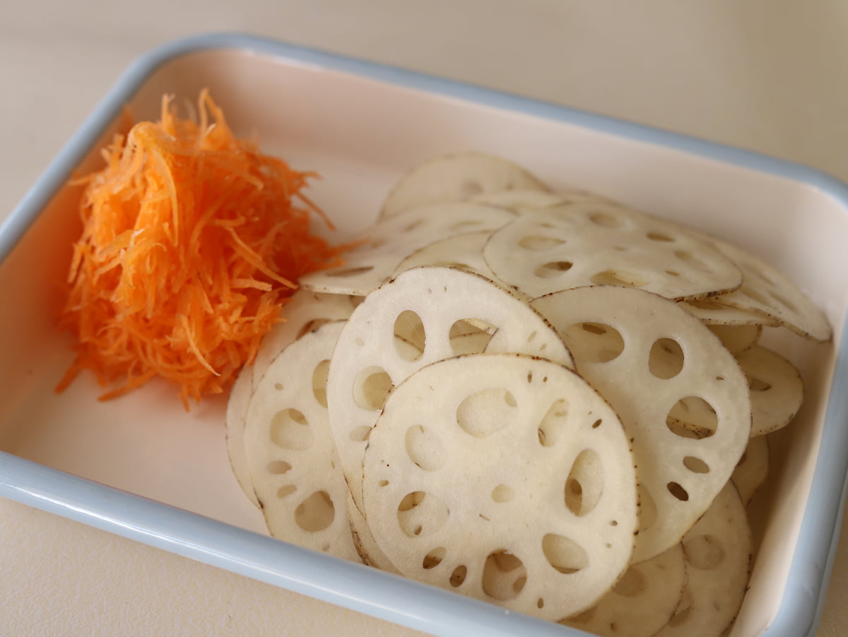 1. れんこんの皮をむいてスライサーで薄切りにする。にんじんは皮をむいてスライサーで細切りにする。