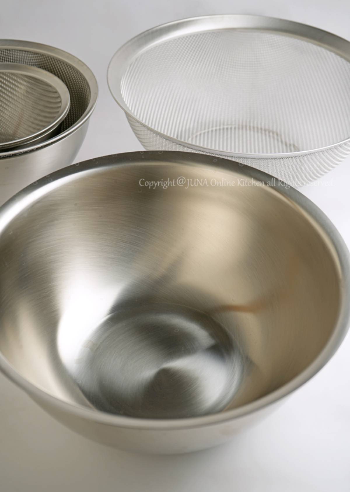 JUNAさんが手にしたのは、15cm・21cm・27cmの全サイズのボウルとざる。