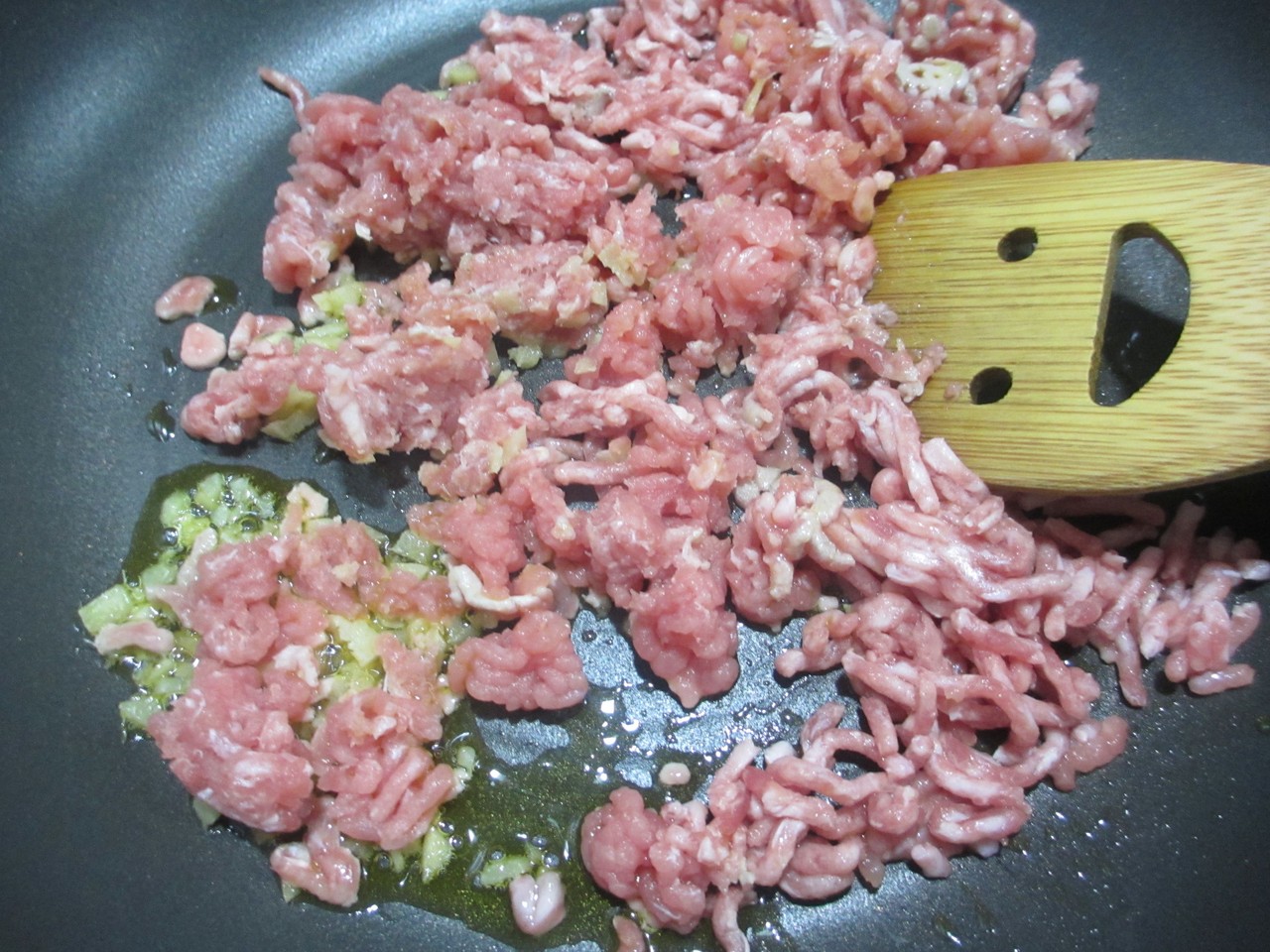 ①フライパンに菜種油を弱火で熱し、しょうがを炒める。香りが立ったら、豚ひき肉を入れて炒める。